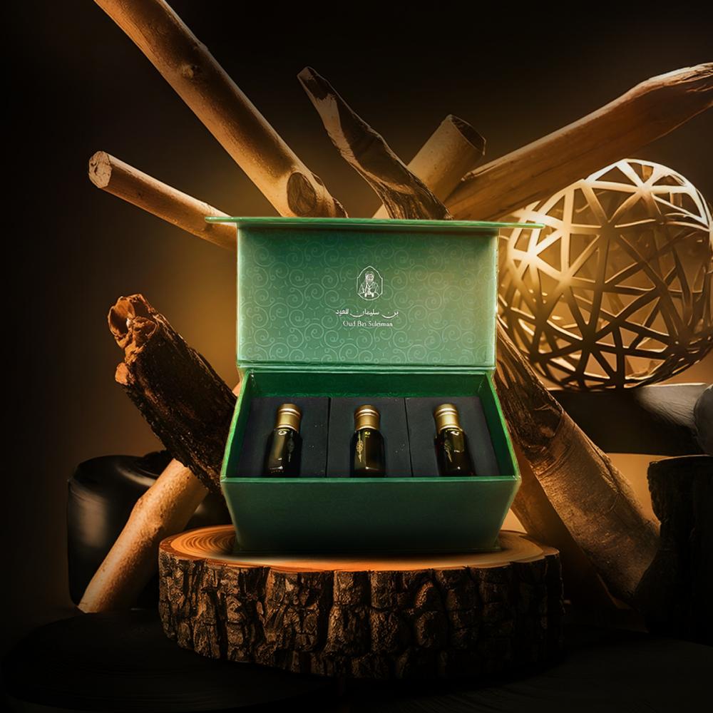 ٣ عبوات من دهن العود المعتق، محفوظة بتعتيق راقٍ، ورائحة تحمل عمق السنوات وثبات الجودة.